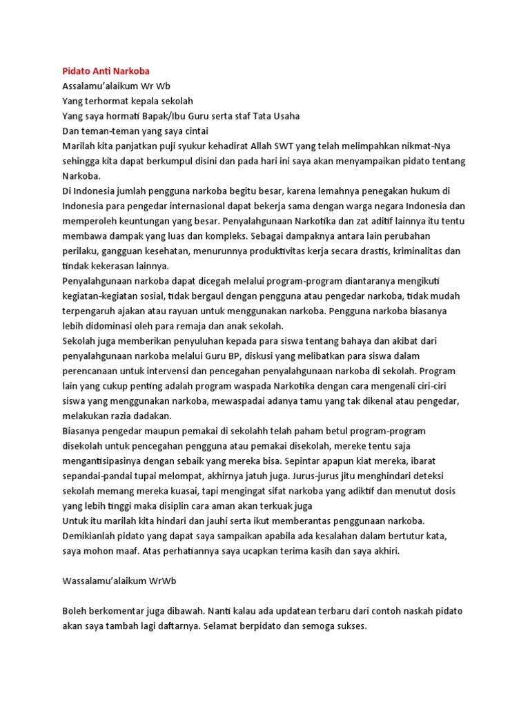 Contoh karangan pidato tentang narkoba. Contoh pidato singkat tentang perpisahan sekolah. Dan atas perhatiannya saya ucapkan banyak terima kasih. Pidato bahaya narkoba oke seperti biasanya saya akan memperkenalkan postingan saya sebelumnya yakni teks pidato tentang korupsi dan pidato perpisahan sekolah sma kali ini saya akan share naskah pidato bahaya narkoba.